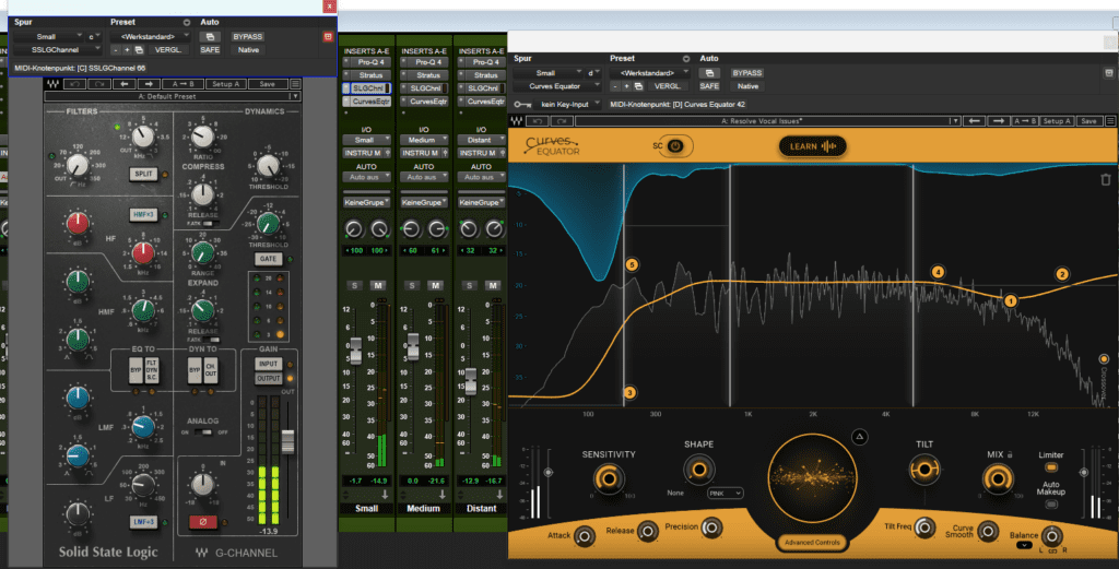 Auch auf die Frequenzbalance sollte weiterer Einfluss genommen werden. Hochfrequente Hallanteile werden bereits im Reverb beschnitten; zusätzlich reduziere ich tiefe Frequenzen mit einem vorgeschalteten EQ, um einem „Verschwimmen“ des Tieftonbereichs vorzubeugen; bei Hall 1 nur leicht, bei Hall 3 deutlich stärker. Hinter dem Reverb-Plug-in verwende ich ebenfalls einen EQ (beziehungsweise Channelstrip), um Signalanteile ab circa 6 bis 7 kHz zu zähmen und den Direktschall nicht zu stören.