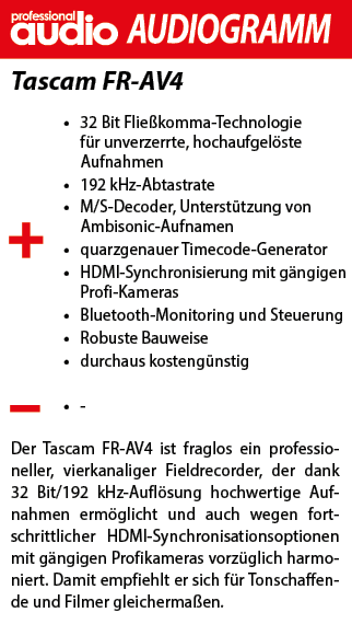 In der Ausgabe 1/2024 hatten wir den Tascam FR-AV2 getestet, einen professionellen, zweikanaligen Fieldrecorder, der des Herstellers Expertise in puncto Mobile Recordern fett unterstrichen hat und sich das professional audio-Prädikat „Oberklasse sehr gut“ redlich verdient hat. Tatsächlich verwenden wir den FR-AV2 seitdem immer wieder gerne, denn mit dem kleinen Mobilisten  lassen sich unkompliziert richtig gute Stereoaufnahmen außerhalb der Studioumgebung machen. Doch schon länger wünschen wir und andere Tascam-Anhänger mehr Kanäle. Ein Wunsch, der anscheinend von den Tascam-Ingenieuren vernommen wurde. Denn seit Herbst dieses Jahres gibt es den großen Bruder des FR-AV2, der sich FR-AV4 nennt und die doppelte Anzahl von Mikrofon-Preamps zu bieten hat. Es sind nämlich vier – ja, nomen est omen – , dafür kostet der Neue auch mehr als das Doppelte: Knapp 900 Euro – den FR-AV2 gibt es für rund 400 Euro – kostet der Fieldrecorder. Dafür hat er auch einiges zu bieten – bereits Bewährtes, aber auch Neues.