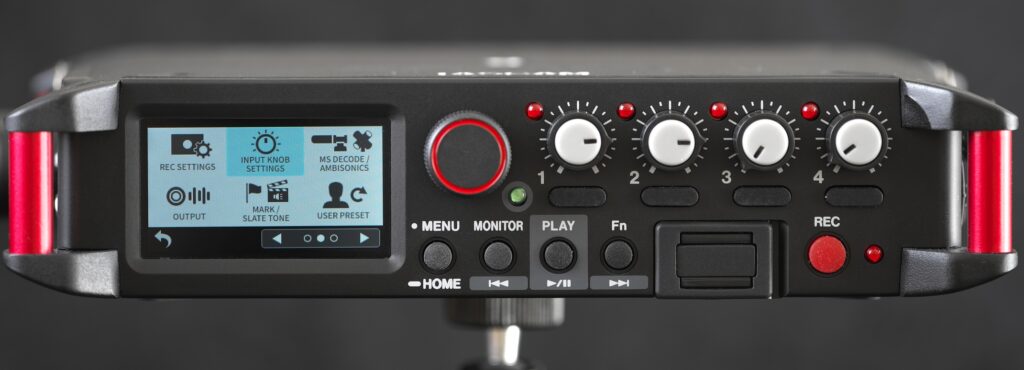 Der FR-AV4 ist ein „Field Recorder“ mit professionellem Anspruch und verfügt wie die meisten Geräte dieser Gerätegattung nicht über eingebaute Mikrofone. Folgerichtig können Tonschaffende ihre Lieblingsmikrofone mit dem Recorder zugunsten optimaler Klangergebnisse verwenden. Dafür bietet der Vierkanaler ein Quartett der bewährten und patentierten Tascam HDDA-Preamps, die sich unter anderem mit einem besonders niedrigen Eigenrauschen von hervorragenden -127 dBu auszeichnen. Deswegen dürfen auch passive Bändchenmikrofone ohne Not an den FR-AV4 angeschlossen werden, um leise Signale aufzunehmen. Der entsprechende darf getrost aufgedreht werden – fiese Störgeräusche sind nicht zu erwarten.