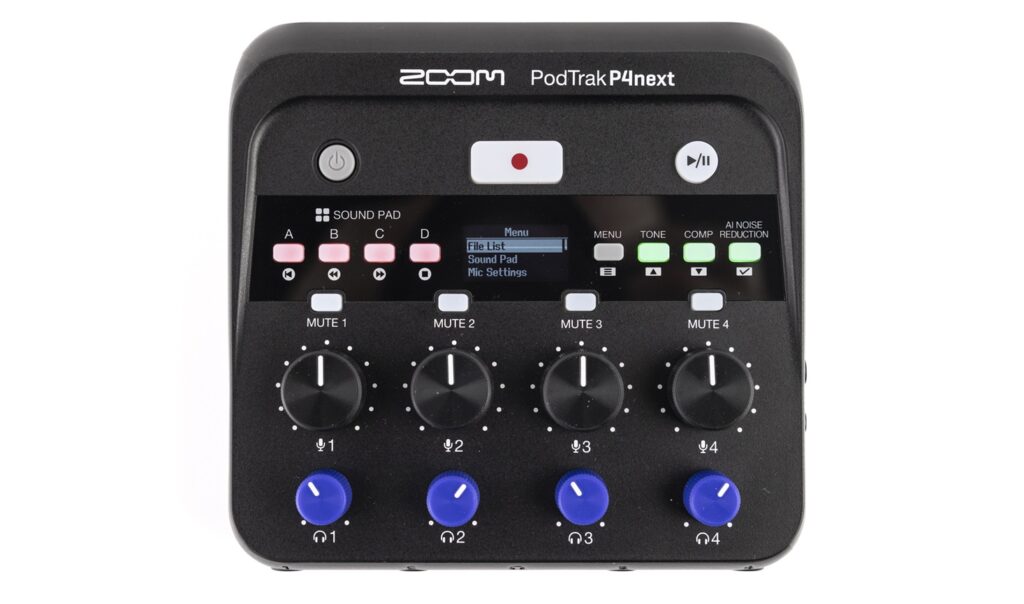 „Ach Gott, wie niedlich!“, schallte es aus der anderen Ecke des Büros, als ich den neuen Zoom PodTrak P4next Recorder auspackte. In der Tat: Ebenso wie der zweikanalige PodTrak P2 (Test in Ausgabe 04/2025) wartet auch dieses Modell mit bemerkenswert kompakten Dimensionen auf, um dem ambitionierten Podcaster und Creator im Mobil-Einsatz das Leben künftig in mehrfacher Hinsicht deutlich leichter zu machen. Konzentrierte sich das P2 auf USB-Mikrofone und das berühmte Vier-Augen-Gespräch, trumpft das P4next jetzt mit vier XLR-Eingängen und gleich vier Kopfhörer-Ausgängen auf, um kleine Diskussionsrunden und/oder Interviews akkurat einzufangen. Damit nicht genug, verfügt es auch über vier Sound-Pads, mit denen sich ad-hoc Jingles einfliegen lassen und dank Mix-Minus-Funktion können auch Smartphone-Gespräche ohne Probleme eingebunden werden. Das sind aber nur die wichtigsten Features dieses, von Zoom selbstbewusst als „Instant Portable Video/Podcast Studio“ betitelten, Winzlings. Um eines vorneweg zu nehmen: Das rund 200 Euro kostende P4next ist ein Paradebeispiel für das „Size doesn‘t matter“-Diktum. Denn obwohl es wie ein Spielzeug daherkommt, wartet es mit vielfältigen Einstellmöglichkeiten auf. Rein konzeptionell erinnert es an Mackies DLZ Creator Pult (Test in Ausgabe 06/2023), das ebenfalls für eine Vierer-Diskussionsrunde ausgelegt ist und über Sound-Pads verfügt, aber durch seine Dimensionen und Features und umfangreichere Ausstattung rund viermal soviel wie das P4next kostet. Doch genug der Vergleiche, schauen wir uns den neuen Zoom-Kandidaten einmal näher an: