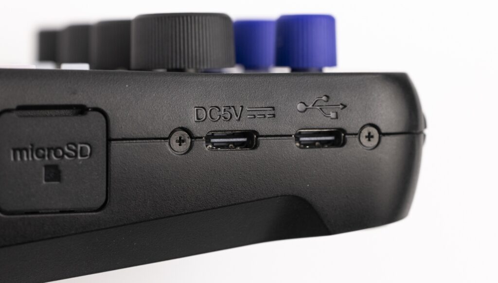 Das Gerät nimmt in etwa den Platz von zwei direkt nebeneinander liegenden Gitarren-Effektpedalen ein. Ebenso wie das Zweier-Modell ist der P4next im gleichen robusten Kunststoff mit rutschfesten Gummiflächen ausgestattet. Sämtliche Anschlüsse sind bombenfest im Gerät verankert und versenkt. Da wackelt rein gar nichts, was sehr gut ist. Mit 300 Gramm Kampfgewicht ist es dennoch sehr leicht und sollte im Einsatz schon besonders gelagert sein, um es nicht durch falsche Bewegungen unachtsam vom Tisch zu fegen. Die XLR-Eingänge sind auf der Kopfseite versammelt, die Kopfhörer-Buchsen auf der Fußseite. Die linke Flanke hält den Schacht zur Aufnahme der MicroSD-Speicherkarte bereit sowie zwei USB-C-Buchsen. Die erste dient ausschließlich zur Stromversorgung via Netzgerät oder Powerbank, die zweite führt bidirektional Datensignale vom P4next in mobile Kommunikationsgeräte und/oder den Rechner. Ein Schiebeschalter aktiviert auf einen Schlag die Phantomspannung in allen vier Eingängen. Die rechte Flanke besitzt ebenfalls einen Schiebeschalter, der den vierten Eingang wahlweise zwischen XLR oder ein angeschlossenes Smartphone umschaltet. Dieses lässt sich an die TRRS-Buchse auf der gleichen Seite via Kabel anschließen. Die zweite, ungleich kleinere Buchse dient zum Anschluss des für rund 60 Euro optional erhältlichen Bluetooth-Adapters BTA-2, mit dem sich Signale vom und zum Smartphone drahtlos übertragen lassen. Ein Blick auf die Unterseite zeigt auch beim P4next ein Batteriefach so dass es sich völlig autark betreiben lässt. Überraschend: Anders als im P2 können hier nur zwei AA-Batterien eingesetzt werden, was wohl der im Gerät verbauten Technik geschuldet ist. Wer herkömmliche Alkaline-Batterien einsetzt und dabei vier Mikros mit Phantomspannung einsetzt, kann – so der Hersteller – das P4next für rund 20 Minuten betreiben. Das ist selbstverständlich nicht sehr üppig. Aber vier Batterien hätten den berühmten Kohl da auch nicht fetter gemacht. Ohne Phantomspannung verspricht Zoom eine Laufzeit von 3,5 Stunden. Mit anderen Batterietypen erhöht sich die Laufzeit jedoch noch einmal. Alles in allem geht das aber in Ordnung. Wer völlig autark arbeiten will, setzt eben eine Powerbank ein.
