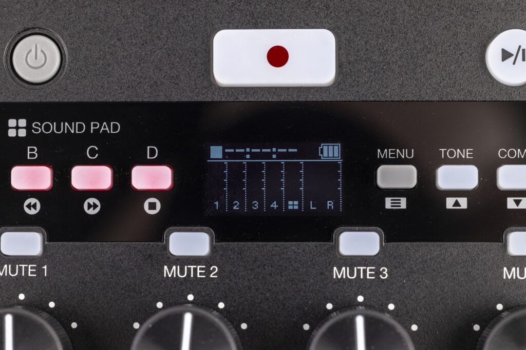 Im Hör- und Praxistest müssen wir beim ersten Einschalten Datum und Uhrzeit einstellen. Das ist wichtig, weil ebenso wie sein kleiner Bruder auch der P4next die Dateibezeichnungen nach Datum und Uhrzeit erstellt. Anschließend ist der Check und die Formatierung der SD-Karte und – sofern nötig – das Einstellen der Sprachsteuerung nötig. Danach ist der P4next für jegliche akustischen Schandtaten bereit. Ab Werk ist übrigens eine kleine Auswahl an Sounds und Jingles auf die Sound Pads geroutet. Das Einpegeln der Mikrofone ist rasch und vor allem gefühlvoll erledigt. Sehr schön: Die Preamps verfügen über satte 70 dB an Gain-Reserven. Da sollten selbst die zickigsten dynamischen Mikrofone ordentlich verstärkt werden. Im Test mit Kondensator-Mikrofonen reicht schon eine Einstellung bis zur Elf-Uhr-Position. Nicht schlecht. Einziger Wermutstropfen ist das Zweifarb-Display, das uns so rein gar keine Rückmeldung gibt, wenn das Mikrofon zu „heiß“ eingestellt ist. Da gilt es, auf die eigenen Ohren zu vertrauen. Abseits dessen geraten die Einstellungen dank Sprachsteuerung, aber primär durch das Display leicht und problemlos. Die Anzeige ist zwar recht winzig. Dennoch sind sämtliche Einstellungen und Werte gut lesbar. Bei der Wiedergabe wird sogar eine Wellenform angezeigt, die mal gar nicht so grobschlächtig daherkommt. Die Navigation durch die Menüs und die Einstellungen mithilfe der Tone-, Noise- und Comp-Tasten sind rasch verinnerlicht. OK, irgendwie erinnert das an die gruseligen Urzeiten digitaler Synthesizer, deren überbordende Zahl an Parametern ebenfalls nur mithilfe von ein paar Tasten und einem Zweizeilen-Display eingestellt werden mussten. Doch der Satz an Einstellungen ist im P4next rasch verinnerlicht, zumal eine Vielzahl davon – etwa die Display-Helligkeit oder die Lautstärke der Sprachsteuerung – nur einmal bemüht wird.